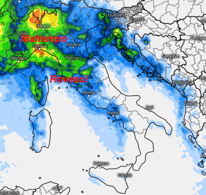 La seconda cartina mostra la sommatoria delle piogge attese in Italia nell’arco della giornata di sabato 25 gennaio: