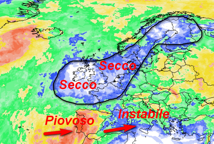 Il maltempo e le piogge dovrebbero percorrere un ipotetico asse passante tra la Penisola Iberica, il Mediterraneo occidentale e l’Italia. In altre parole, sarà probabile un periodo piovoso sul nostro Paese, dettato da correnti umide, ma non fredde di matrice occidentale. Notate infine l’alta pressione, evidenziata dalla zona con piogge scarse, che tenderà a ritirarsi verso nord-est, senza più interessare le aree di nostro interesse.