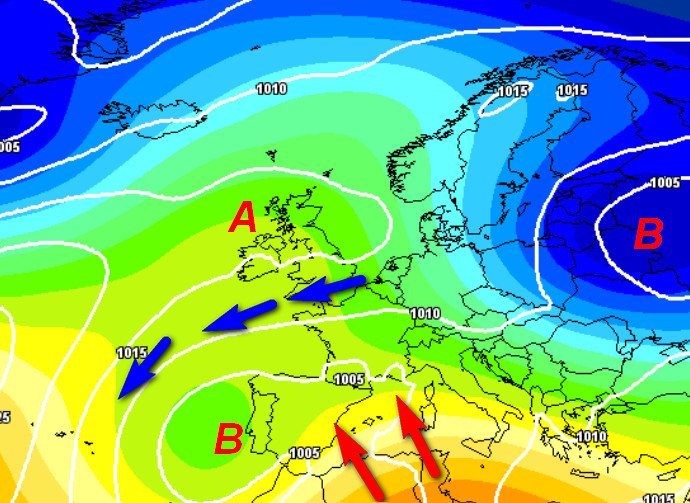 Notiamo una depressione presente poco ad ovest del Portogallo che inizierà a far sentire i suoi effetti a partire dal Mediterraneo occidentale dove si imposteranno umide correnti sciroccali (frecce rosse). L’aria fredda tenderà a spostarsi verso levante, mentre i settori centro-settentrionali del Continente resteranno sotto la protezione dell’alta pressione, che tuttavia si presenterà meno solida rispetto al periodo attuale.