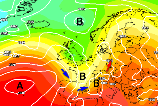 Il guasto, diffuso e marcato, prende spunto dall’affondo di una saccatura tra la Francia e il nord Italia, in successivo movimento verso il resto del Paese, con fenomeni temporaleschi a ripetizione e precipitazioni abbondanti, qui la mappa barica che lo evidenzia, siamo al 3-4 luglio: