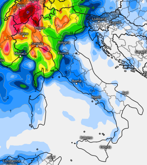 Osserviamo giusto una mappa con i risvolti precipitativi previsti nella fase iniziale del peggioramento, si vede bene la traccia dei fenomeni più intensi tra Liguria, alta Toscana, Lombardia ovest e Canton Ticino, in movimento verso sud est: