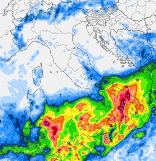 Qui sotto invece la sommatoria dei fenomeni attesa tra venerdì 17 e domenica 19 ottobre su tutta l’area del meridione, si nota il particolare accanimento dei fenomeni sull’area jonica, con rischio di nubifragi sulle coste calabresi, lucane e pugliesi: