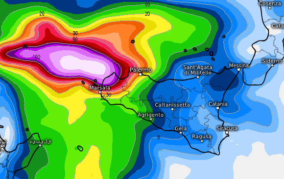 Qui sopra la distribuzione dei fenomeni prevista per mercoledì 16 ottobre con la Sicilia che verrà interessata da un nucleo temporalesco molto intenso in movimento da ovest verso est.