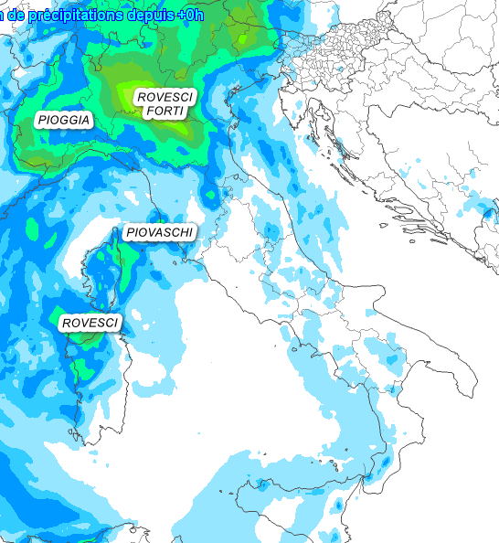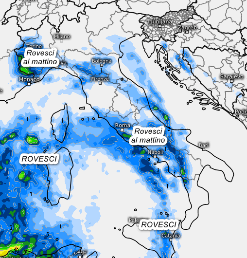 Andiamo però con ordine. La prima mappa mostra la sommatoria delle precipitazioni attese in Italia fino alla mezzanotte su giovedi 11 aprile: