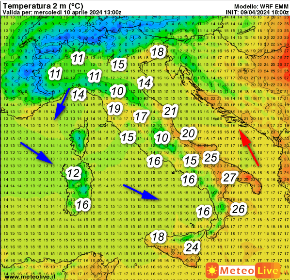 Dicevamo del sensibile calo delle temperature al nord-ovest ed in Sardegna con alcune aree che non supereranno i 15°. Temperature in calo anche sul resto d’Italia con punte di caldo residuo solo sulla Puglia, la Calabria ionica e l’est della Sicilia dove si potrebbero toccare i 25-27°.