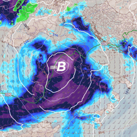 Il vortice ciclonico che abbraccia la Penisola determina il passaggio di un intenso fronte perturbato al centro, al sud e poi sul nord-est, accompagnato da un minimo pressorio al suolo: attesi fenomeni rilevanti e anche la neve sull'Appennino centro-settentrionale e le Alpi orientali. Lunedi ancora piogge su estremo nord-est, Adriatico e basso Tirreno, martedì miglioramento, poi...
