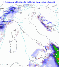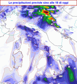 Oggi rovesci su centrali tirreniche, Emilia, Triveneto, Sardegna occidentale, sud ed est Sicilia, Calabria jonica, migliora sul nord-ovest, fenomeni sporadici altrove. Domenica nuvolosità irregolare con tendenza a peggioramento serale su nord-ovest e sullo Jonio. Da lunedì a mercoledì spesso piogge su nord-ovest e sullo Jonio, mite ed asciutto altrove. Giovedì e venerdì maltempo su gran parte d'Italia.