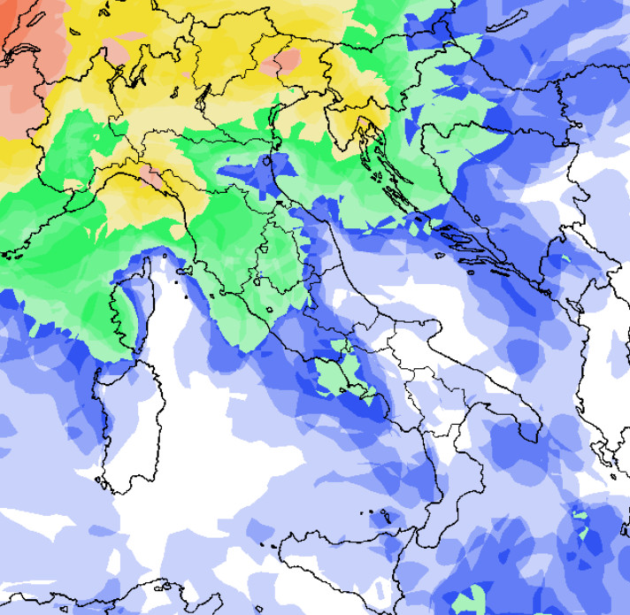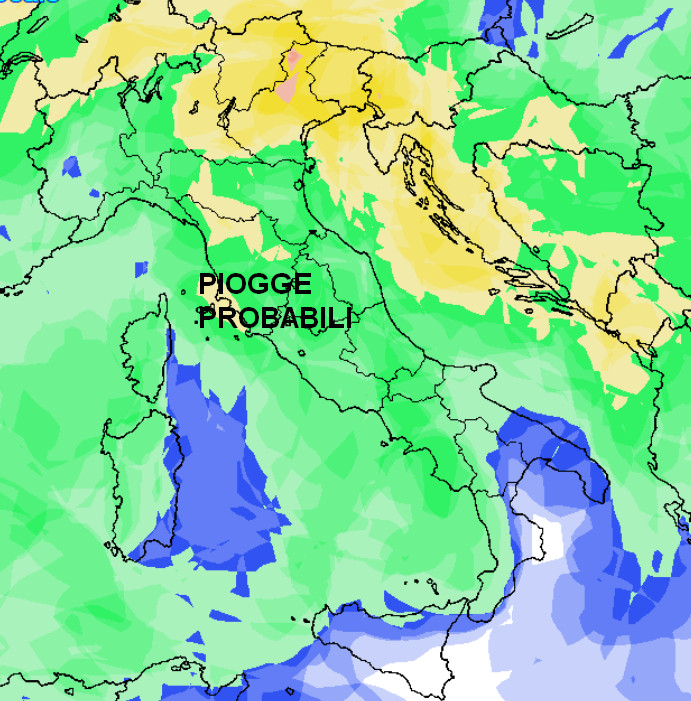 Ecco le regioni settentrionali che verranno interessate da una probabilità di pioggia tra MEDIA ed ELEVATA, che si estenderà anche alle zone dell’alto-medio Tirreno ed interne centrali. Le regioni meridionali e le Isole potranno saltuariamente usufruire di una curvatura anticiclonica delle correnti ed avere una probabilità di pioggia più BASSA se non del tutto NULLA dove vedete il colore bianco sulla cartina; in altre parole, condizioni meteorologiche migliori.