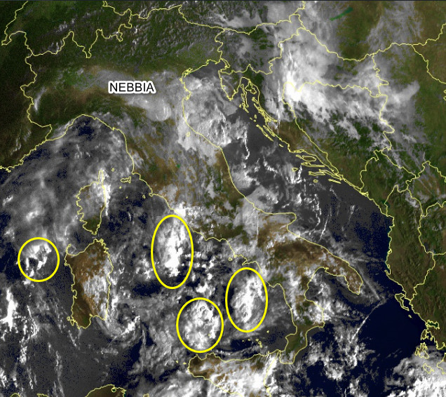 Ancora rovesci o temporali in mare aperto con locali estensioni alle coste delle due Isole Maggiori e forse al medio Tirreno. Al mattino qualche pioggia anche al nord-ovest, ma in attenuazione nell’arco della giornata, pioviggini o piovaschi sul medio-basso Adriatico, per il resto situazione invariata, ma con meno nebbia in Valpadana.