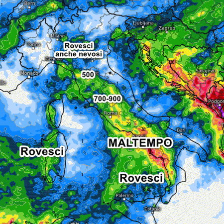 Ancora maltempo abbastanza severo sulle regioni del medio-basso Tirreno dove insisteranno rovesci e temporali. Rovesci anche sul resto del centro, specie sul Tirreno, la Sardegna e le aree interne con quota neve in calo sull’Appennino centrale fino a 700-900 metri. Al nord e sulla Toscana instabilità fredda con rischio di rovesci di grandine, graupel e neve sopra i 500 metri, localmente in pianura sull’Emilia Romagna, il basso Veneto e l’est della Lombardia tra la serata e la notte.