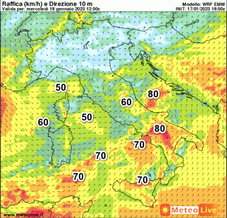 Attenzione ancora alle raffiche di vento. Questa è la mappa eolica riferita alle ore 13 di oggi, mercoledi 18 gennaio: