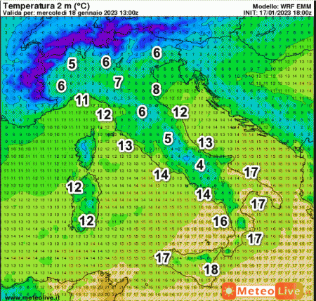 Freddo al nord e nelle aree interne dell’Italia centro-meridionale con valori sotto i 10°. Più mite il clima altrove con punte di 17-18° sulla Sicilia e sulla Calabria.