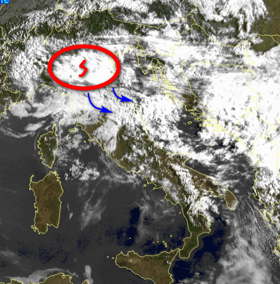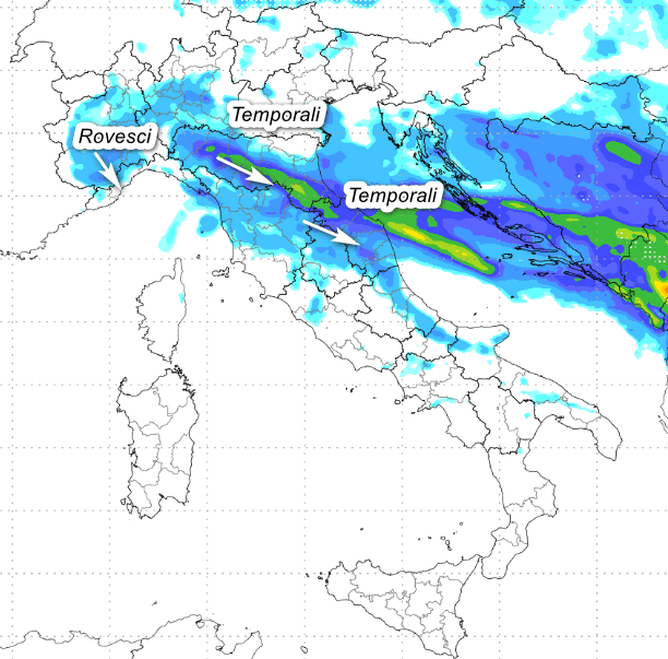 Temporali anche intensi in trasferimento dalla Lombardia ed il Veneto verso l’Emilia Romagna e poi giù in direzione delle Marche, le aree interne della Toscana e l’Umbria settentrionale: fenomeni anche intensi ed accompagnati da grandine. Rovesci più irregolari saranno presenti in Piemonte, con sconfinamenti attenuati verso la Liguria (specie versanti padani). Sul resto d’Italia tutto tranquillo, se si eccettua qualche piovasco nelle aree interne dell’Abruzzo.