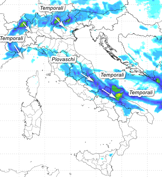 Temporali in marcia da nord-ovest tra l‘Abruzzo, il Molise e la Puglia con fenomeni anche intensi ed accompagnati da grandine specie nell’area garganica. Piovaschi sparsi tra la Liguria appenninica, l’alta Toscana, l’Umbria e le aree interne delle Marche. Temporali su ovest Alpi, bassa Val d’Aosta, alto Piemonte ed alta Lombardia con qualche sconfinamento in direzione delle aree pianeggianti adiacenti; temporali anche tra l’alto Veneto, il Trentino ed il Friuli. Sul resto d’Italia situazione decisamente più tranquilla con tempo asciutto. TEMPERATURE in calo sotto eventuali rovesci o temporali.