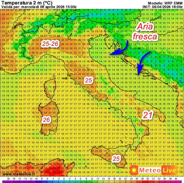 Queste invece sono le temperature previste al suolo alle ore 15 di mercoledi 8 aprile:
