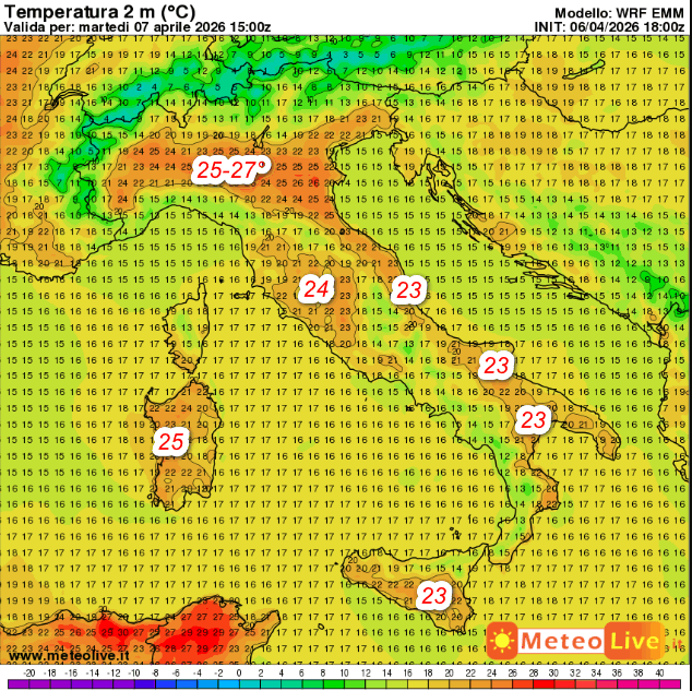Nelle prossime 24-36 ore continuerà l’anticipo d’estate soprattutto in Valpadana e sulle Isole: la prima mappa mostra le temperature al suolo attese in Italia alle ore 15 di martedì 7 aprile: