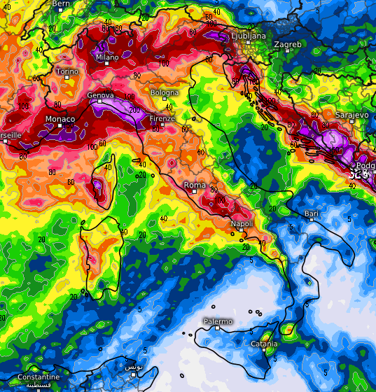 Abbondanti (sino a 200mm) quelle attese invece sul Levante ligure, su alta Lombardia, alto Veneto e Friuli Venezia Giulia, importanti comunque le precipitazioni previste su Sardegna, versante centrale tirrenico e resto del nord. Seguite tutti gli aggiornamenti su MeteoLive.it