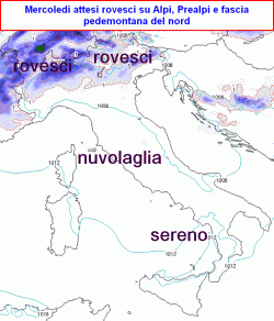 Una lieve flessione del campo barico consentirà il transito di un debole corpo nuvoloso sul settentrione, foriero di rovesci nel corso della giornata di mercoledì, specie lungo le Alpi. Un po' di nuvolaglia a tratti transiterà anche al centro, per il resto prevalenza di sole. Nel fine settimana caldo estivo su molte regioni.
