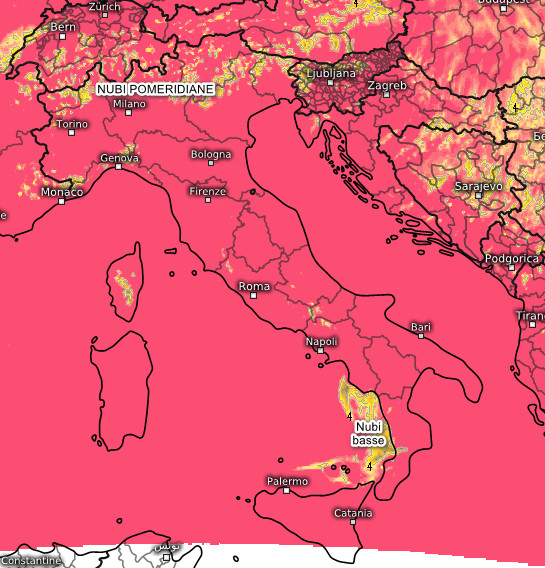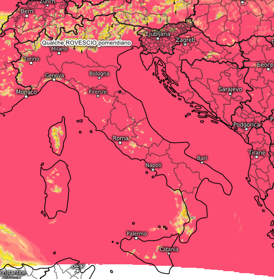 Splendida giornata di sole su tutta l’Italia. Da segnalare solo qualche nube bassa sulla Calabria Tirrenica ed uno sviluppo di nubi cumuliformi pomeridiane limitato alle Alpi con forse la possibilità di qualche isolato acquazzone, in attenuazione dopo il tramonto. Ulteriore aumento termico su tutta l’Italia con valori superiori alla media del periodo.