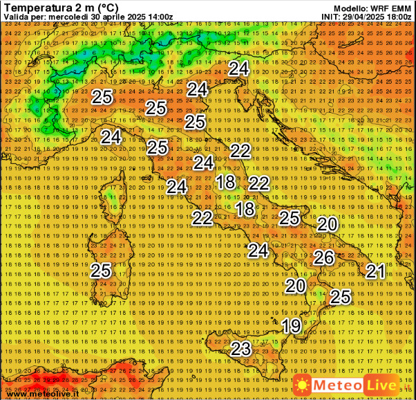 Sul fronte delle temperature, questi sono i valori attesi in Italia alle ore 16 di mercoledi 30 aprile: