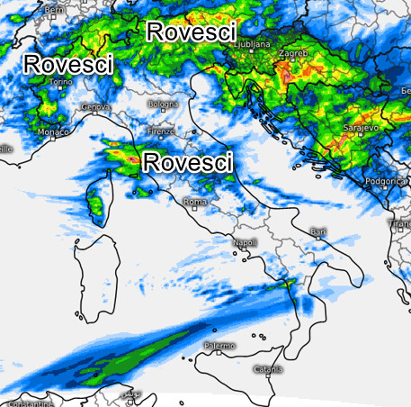 Rischio acquazzoni su Alpi, Prealpi, alte Pianure, Triveneto e regioni centrali, specie sulla media e bassa Toscana. Qualche piovasco in prospettiva anche tra Sicilia e Calabria, per il resto tempo asciutto.