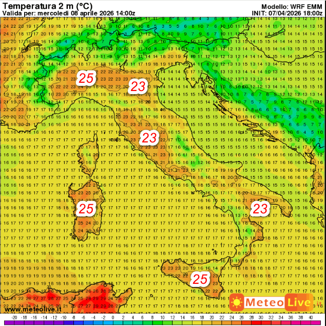 Passiamo al quadro termico. La prima mappa mostra le temperature attese in Italia alle ore 16 di mercoledi 8 aprile: