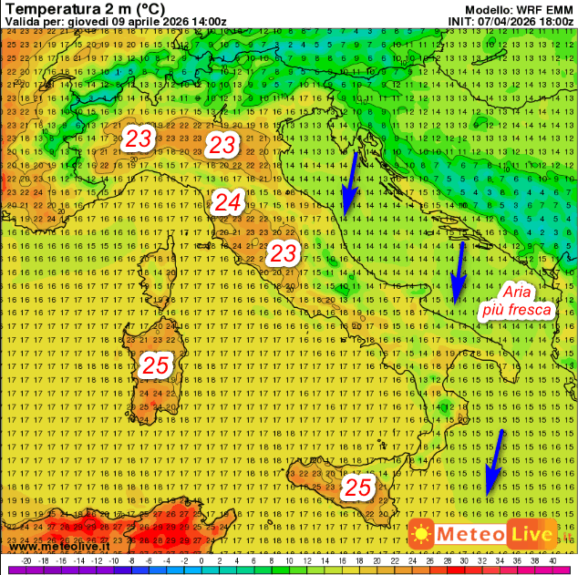 Nella giornata di giovedì 9 aprile l‘aria fresca scivolerà verso est toccando il medio-basso Adriatico ed il meridione peninsulare con un po’ di vento da nord ed un calo termico. Queste sono le temperature attese in Italia alle ore 16 di giovedi 9 aprile: