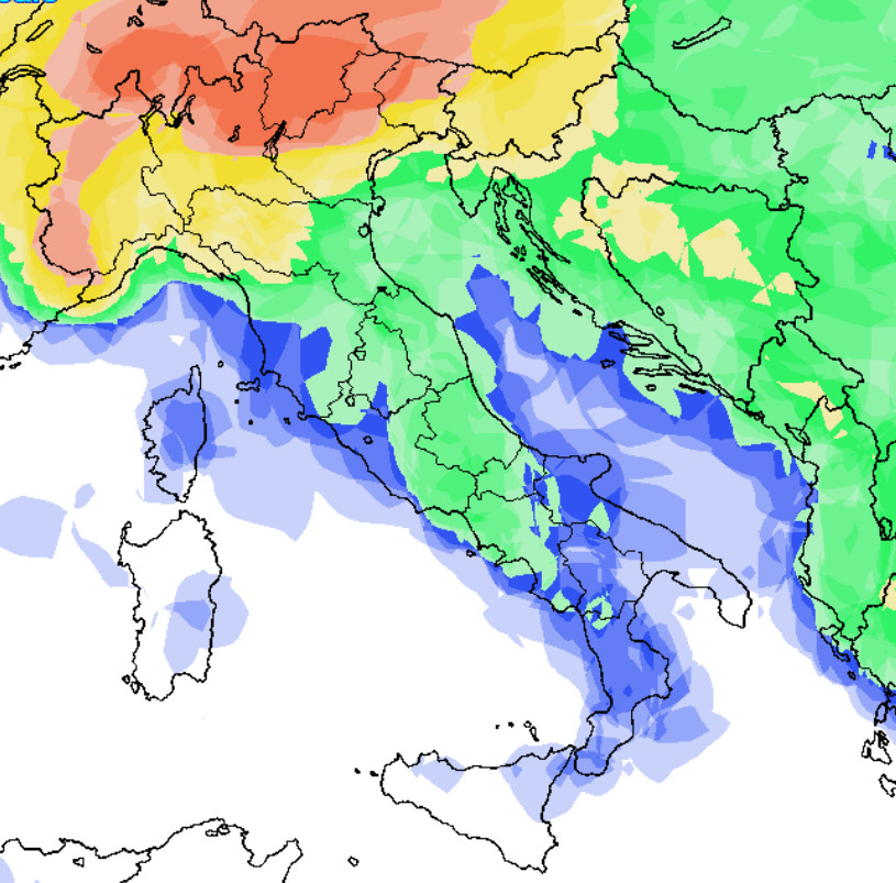 - Una probabilità media (tra il 25% e il 50%, in verde) interesserà le aree interne del Centro e alcuni settori del Meridione, qui i temporali saranno più sporadici ma non da escludere. Sulle restanti zone, indicate con il colore bianco o blu sulla cartina, la probabilità di fenomeni sarà bassa o del tutto nulla.
