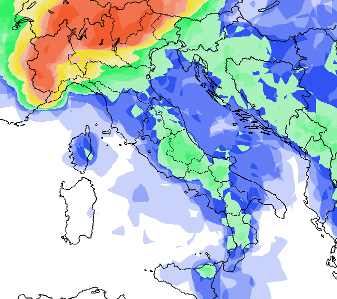 Notiamo come la massima probabilità di avere temporali, fino ad elevata, sarà presente in prossimità dei rilievi alpini e delle alte pianure, ma un po’ su tutto il settentrione e le aree interne del centro la suddetta probabilità tenderà ad aumentare. Resterà invece bassa o del tutto nulla sulle restanti aree della Penisola.