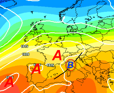 Si nota una deformazione elastica dell’alta pressione ad opera di una perturbazione atlantica piuttosto debole. Dalla mappa si nota come l’attacco perturbato quasi sicuramente non sarà vincente, con la struttura stabilizzante che potrebbe avere la meglio sull’eventuale maltempo.