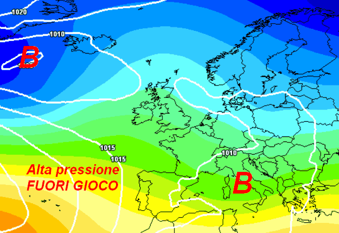 Osservate l’alta pressione che verrà messa fuori causa e tenderà a ritirarsi in oceano. Su tutto lo scacchiere europeo prenderà piede una vasta circolazione depressionaria anche piuttosto fredda con condizioni instabili, se non del tutto perturbate sul nostro Paese da nord a sud.