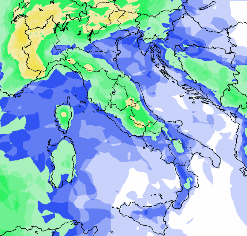 Notiamo una probabilità di pioggia media o medio-alta sulle regioni settentrionali, nelle aree interne del centro e sulla Sardegna. Sul resto d’Italia sarà presente una probabilità di pioggia bassa se non del tutto nulla dove vedete il colore bianco sulla cartina.