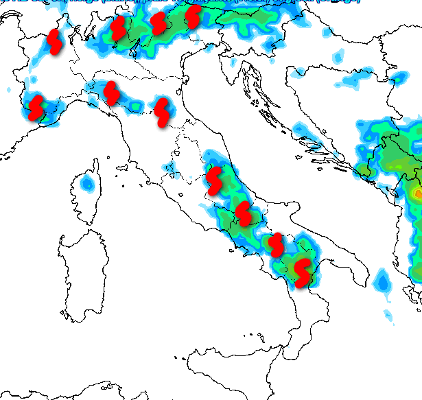 Sul fronte dei fenomeni, si attiveranno temporali convettivi o di calore nelle zone interne nel pomeriggio, come mostra questa mappa incentrata alle ore 15 di giovedi 25 luglio: