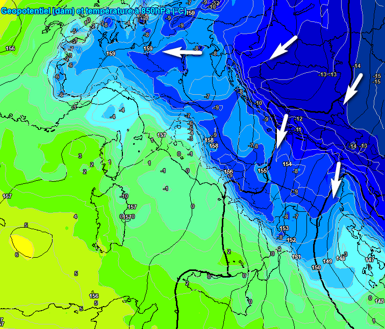 Chiaro che di fronte a questa frenata potrebbe scaturirne qualcosa di interessante non solo sul piano del freddo (qui sotto un esempio di temperature a 1500m), ma anche delle precipitazioni nevose a quote basse: