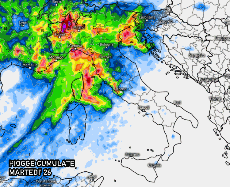 L’apice del maltempo giungerà martedì 26, come evidenziato dal modello europeo ECMWF, che ci mostra precipitazioni molto diffuse e abbondanti su quasi tutto il Nord e il Centro Italia, specie sui settori più esposti come Toscana, Liguria, Piemonte, alta Lombardia, Trentino Alto Adige e Veneto. Su queste regioni potrebbero svilupparsi temporali persistenti capaci di riversare al suolo enormi quantità di pioggia, una delle più classiche configurazioni autunnali per il Nord Italia e il versante tirrenico: