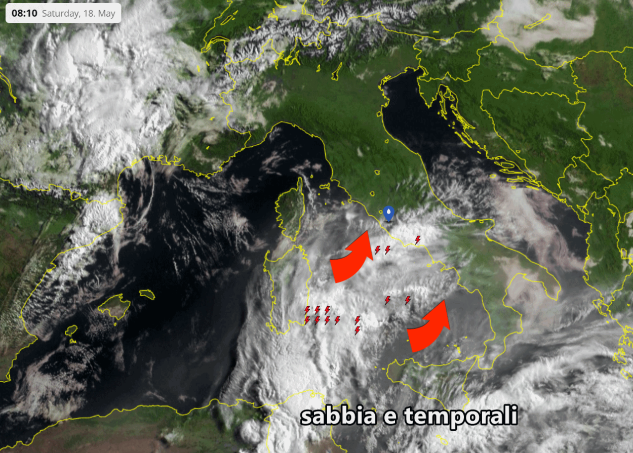 Dall’immagine del satellite possiamo anche notare l’elevata concentrazione di polvere desertica sospesa in atmosfera, che rende i nostri cieli sporchi e lattiginosi su tutto il Centro-Sud Italia, mentre il Nord è un po’ più al riparo da questa ventata di polvere sahariana.