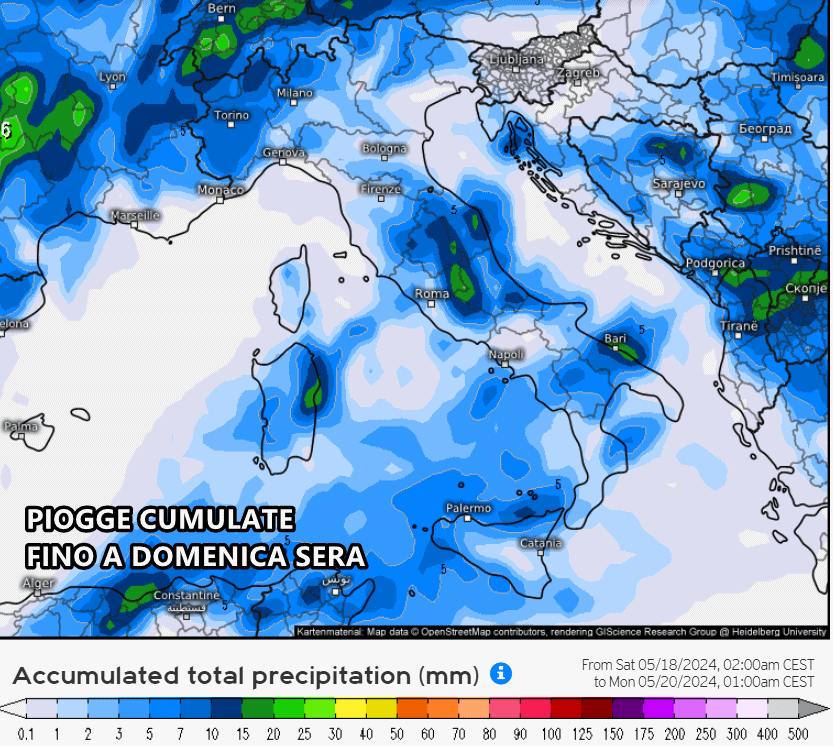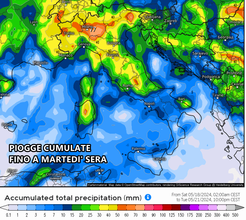 Discorso diverso per l’avvio della prossima settimana, quando la perturbazione si fionderà a pieno sulle regioni del Nord, garantendo tante precipitazioni abbastanza diffuse e anche locali forti temporali. Sono previsti accumuli abbastanza consistenti su regioni già martoriate dal maltempo negli ultimi giorni come Lombardia e Veneto. Tutte queste piogge andranno a sommarsi a quelle già cadute in precedenza e di conseguenza potrebbero causare nuovi disagi e anche allagamenti, considerando che i terreni sono già saturi e non hanno avuto sufficiente tempo per smaltire tutta la pioggia caduta in pochi giorni.