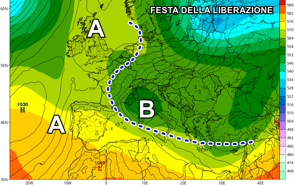 Prima di questa presunta ondata di freddo, ci sarà una nuova ondata di maltempo sulla nostra penisola, soprattutto tra il 24 e il 26 aprile. L’alta pressione delle Azzorre potrebbe ergersi sull’Europa occidentale, estendendosi fin su Gran Bretagna e Islanda, mentre una perturbazione si distaccherà dall’Artico per poi fiondarsi prima sull’Europa centrale e infine sulla nostra penisola. Ed è proprio all’interno del Mediterraneo che potrebbe dar vita a un vortice di maltempo che andrebbe a colpire in modo più diretto le regioni centro-settentrionali nella Festa della Liberazione.