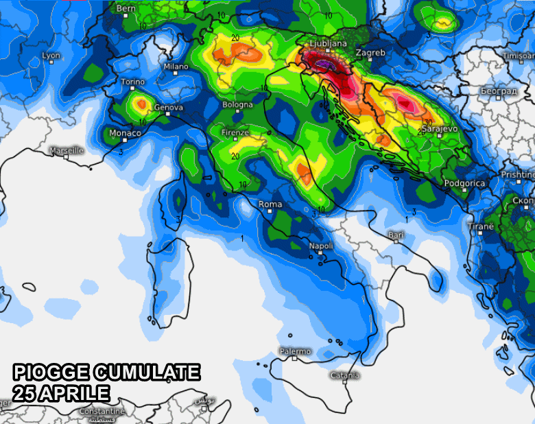 Insomma, si rischia un 25 aprile perturbato, con l’ombrello a portata di mano su tante città del Centro e del Nord Italia. Secondo le ultimissime indicazioni del modello americano GFS, il maltempo potrebbe coinvolgere in modo più diretto il Nord-est e le regioni centrali, con accumuli localmente abbondanti.