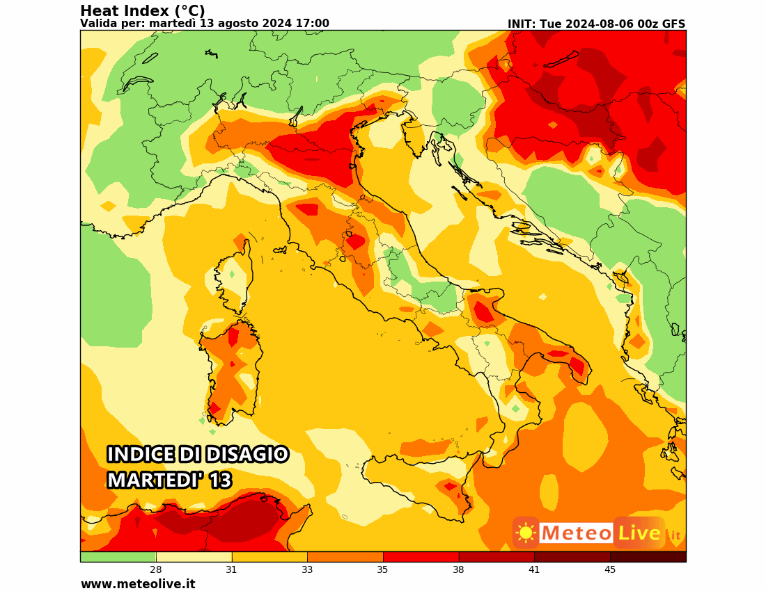 In tutto questo, però, le temperature non subiranno grandi scossoni! Come si evince dalla mappa dell’indice di disagio per martedì 13, la calura sarà ancora presente soprattutto al nord!