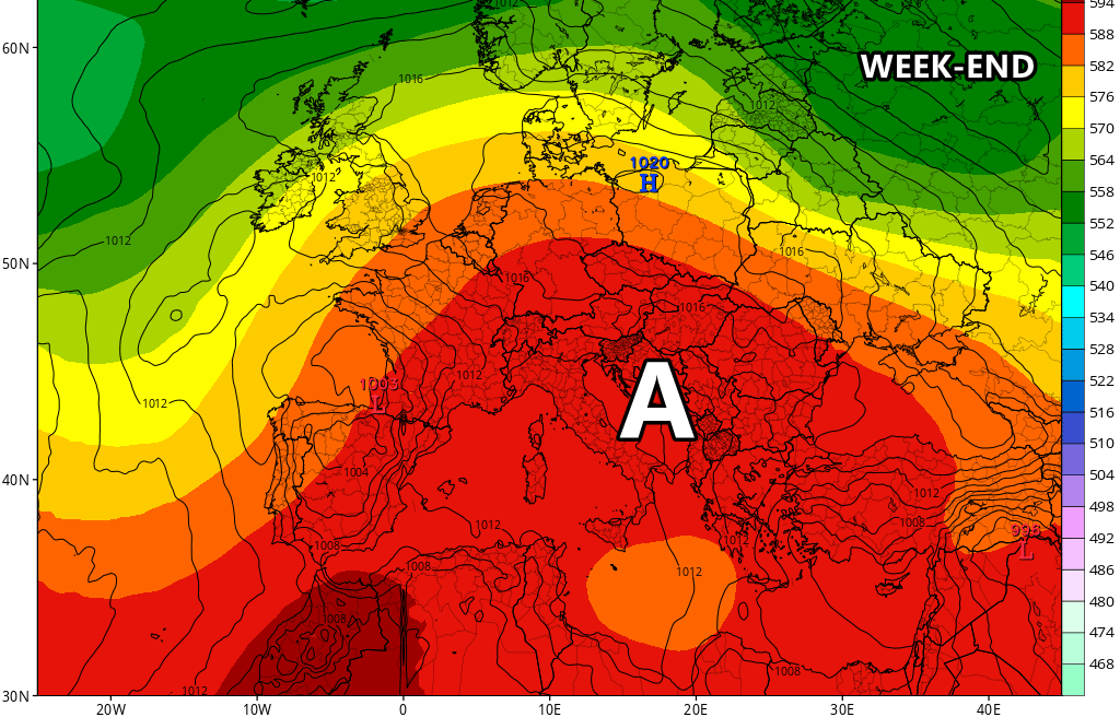 L’anticiclone africano sta riprendendo in mano le redini della situazione dopo il leggero indebolimento dello scorso week-end. Ora il caldo tenderà man mano ad intensificarsi, divenendo nuovamente eccessivo specie al sud e sulle isole maggiori! Nel week-end avremo un solido anticiclone su tutta Italia, non lasciando spazio nemmeno ai temporali pomeridiani che, invece, avremo nei giorni precedenti.