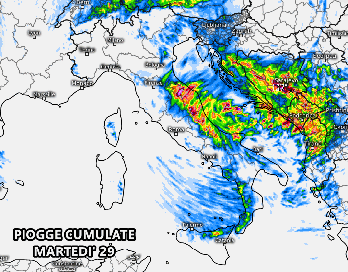 Questa perturbazione avrà ripercussioni anche nella giornata di martedì 29 luglio su diverse nostre regioni. L’intera depressione tenderà pian piano a muoversi verso i Balcani, ma il fronte occluso della perturbazione porterà ancora delle piogge e dei rovesci su alcune nostre regioni, come ad esempio Marche, Romagna, Abruzzo, Molise e Puglia. Le zone più colpite, chiaramente, saranno quelle marchigiane e abruzzesi, dove si prevedono accumuli di pioggia nella prima parte di martedì superiori ai 40 o 50 mm, i quali andranno a sommarsi a tutta la pioggia caduta oggi.