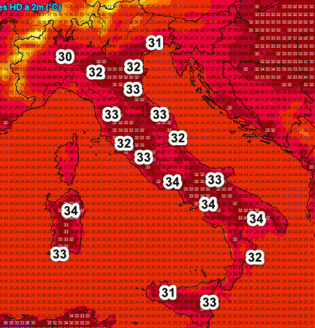 Punte di 34° sulla Lucania, la Campania e la Sardegna. Molte aree con temperature attorno a 32-33°; quindi avremo un’altra giornata di piena estate.