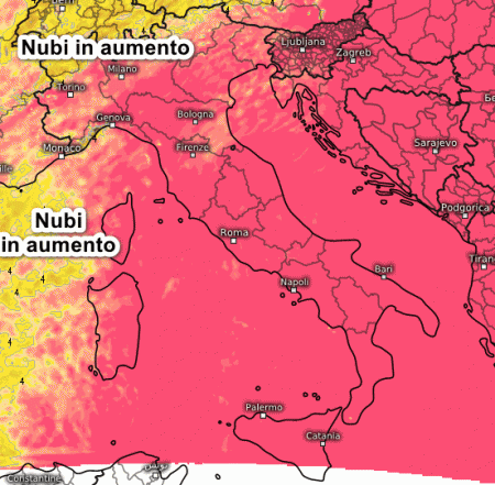Si notano i primi segni di cambiamento sul nord-ovest con un aumento della nuvolosità. Qualche velatura potrebbe raggiungere anche la Sardegna, per il resto ancora sole dardeggiante e caldo.