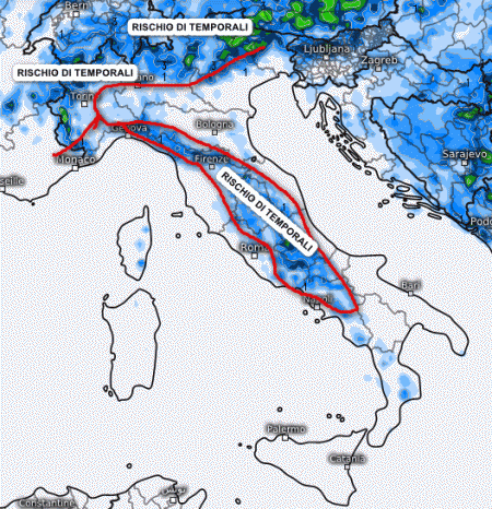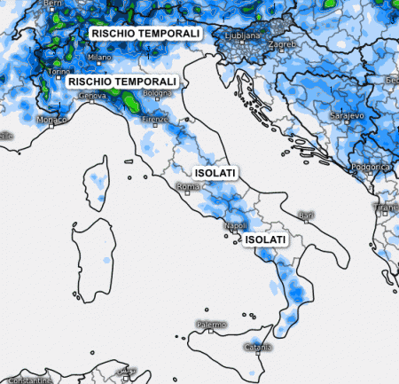 Ancora temporali locali, ma potenzialmente intensi tra il pomeriggio e la serata su Alpi, Prealpi, in sconfinamento tra la sera e la notte anche su alcune aree della Valpadana, specie sulla pianura piemontese.