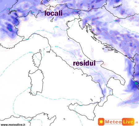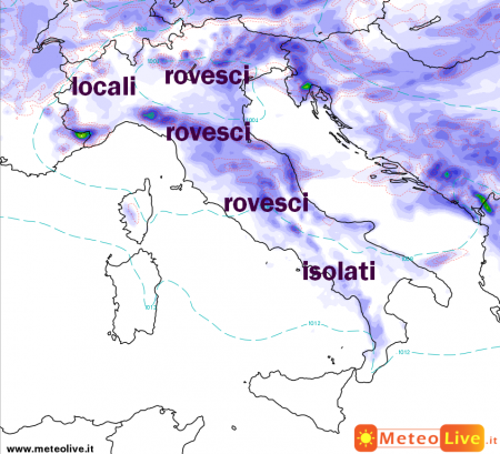 -qualche rovescio o temporale pomeridiano-serale su est Lombardia, Triveneto, zone interne appenniniche del nord e del centro, solo occasionali sulle rimanenti zone del Paese, però generalmente asciutto sulle isole con prevalenza di sole.