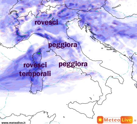 EVOLUZIONE: venerdì è atteso il passaggio di una perturbazione più organizzata che determinerà annuvolamenti estesi e rovesci sparsi, anche a carattere temporalesco al nord, sulla Sardegna e le regioni centrali tirreniche, come si nota nella mappa seguente: