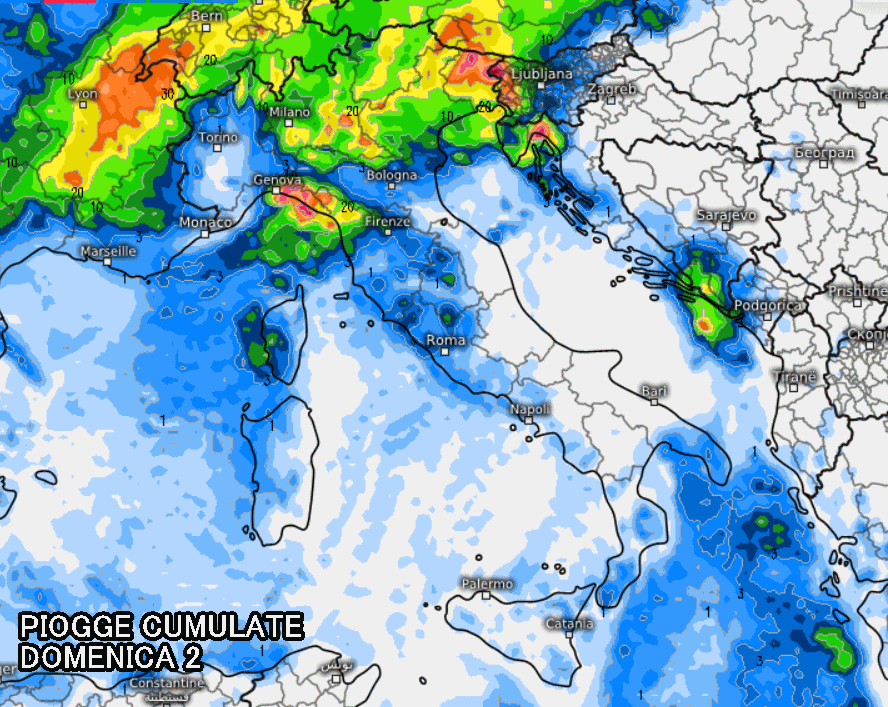 Le piogge più intense sono attese sulla Liguria orientale e soprattutto a ridosso dei monti, dove agirà il fenomeno dello stau, ossia l’accrescimento verticale delle nubi dovuto al sollevamento forzato dell’umidità in presenza dei venti di libeccio e scirocco. Stesso discorso per Trentino Alto Adige, Veneto, Friuli Venezia Giulia e alta Lombardia, dove si prevedono accumuli compresi tra 40 e 80 mm.