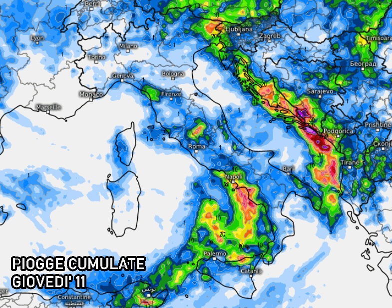 Nella giornata di giovedì 11 settembre avremo a che fare con rovesci sparsi e temporali sulle regioni del sud, specie sul versante tirrenico tra Campania, Calabria e Sicilia. Rovesci sparsi sconfineranno anche sul versante ionico e non escludiamo lo sviluppo di improvvisi forti acquazzoni con grandinate anche sulla Puglia e sulla Basilicata. Avremo ancora precipitazioni sparse residue sulle regioni centrali e anche sul nord-est, dove il miglioramento avrà inizio nella seconda parte della giornata.