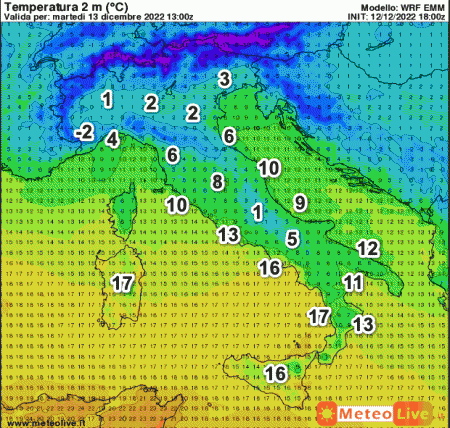 Valori non superiori a 1-2° in Valpadana nelle ore centrali della giornata! Freddo anche nelle aree interne del centro, molto più miti le Isole e le regioni meridionali con punte di 16-17°.